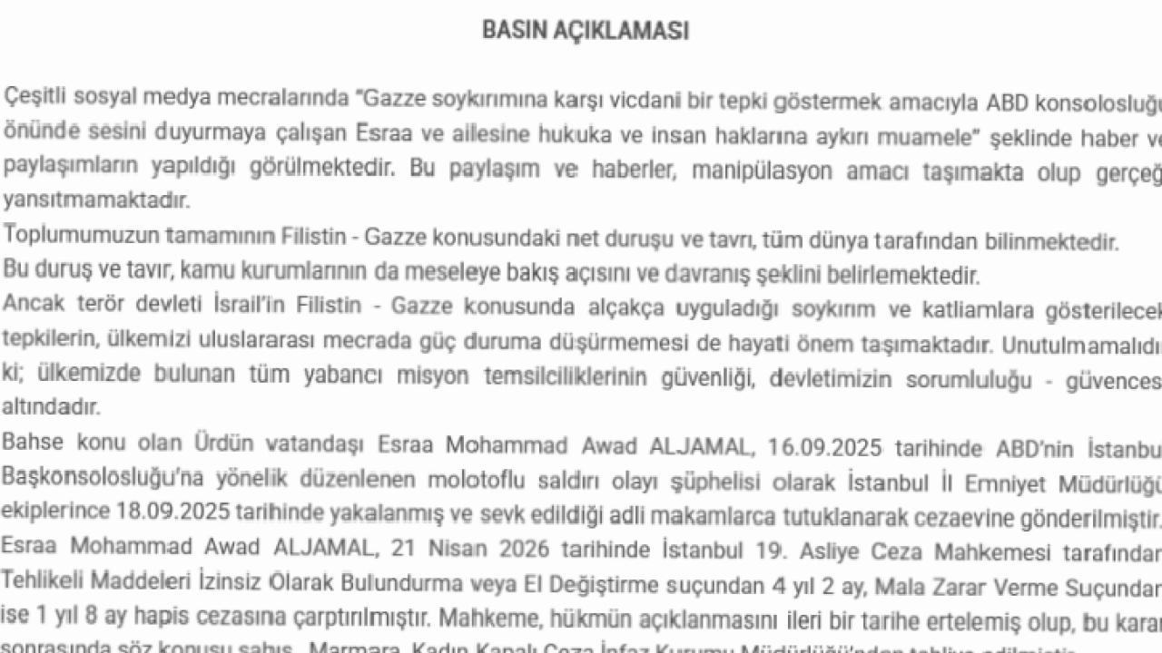 Valilik, Ürdün vatandaşı Esraa Mohammad Awad Aljamal’ın 16 Eylül 2025’te ABD’nin İstanbul Başkonsolosluğu’na yönelik molotoflu saldırının şüphelisi olarak 18 Eylül’de yakalandığını ve çıkarıldığı mahkemece tutuklandığını açıkladı.