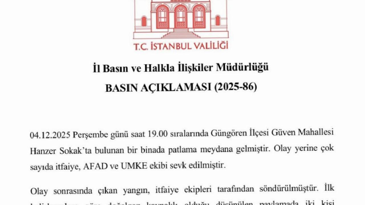 04.12.2025 Perşembe günü saat 19.00 sıralarında Güngören İlçesi Güven mahallesi Hanzer Sokak’ta bulunan bir binada patlama meydana gelmiştir. Olay yerine çok sayıda itfaiye, AFAD ve UMKE ekibi sevk edilmiştir. Olay sonrasında çıkan yangın, itfaiye ekipleri tarafından söndürülmüştür.