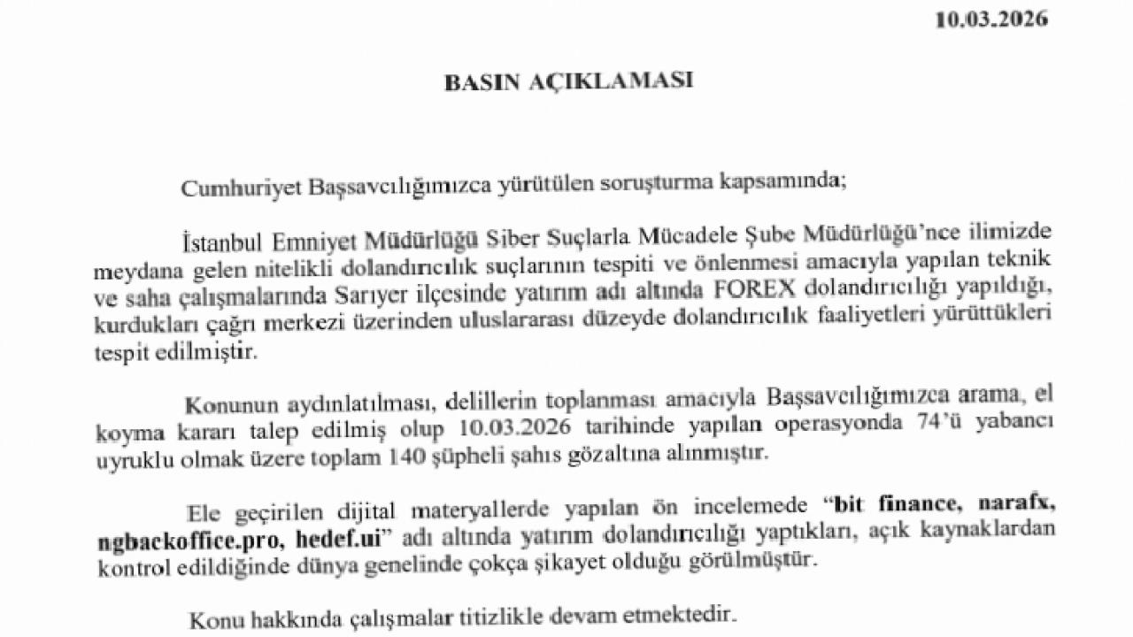 İstanbul Emniyet Müdürlüğü Siber Suçlarla Mücadele Şube Müdürlüğü ekipleri tarafından nitelikli dolandırıcılık suçlarının tespiti ve önlenmesine yönelik yürütülen teknik ve saha çalışmalarında, Sarıyer ilçesinde kurulan bir çağrı merkezi üzerinden uluslararası düzeyde dolandırıcılık faaliyetleri yürütüldüğü belirlendi.