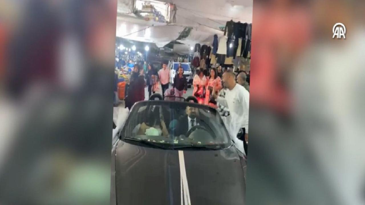 Gelin arabasının daha sonra pazar içinde yoluna devam etmesi, çevredekilerin de yaşananları gülümseyerek izlemesi görüntülerde yer aldı.