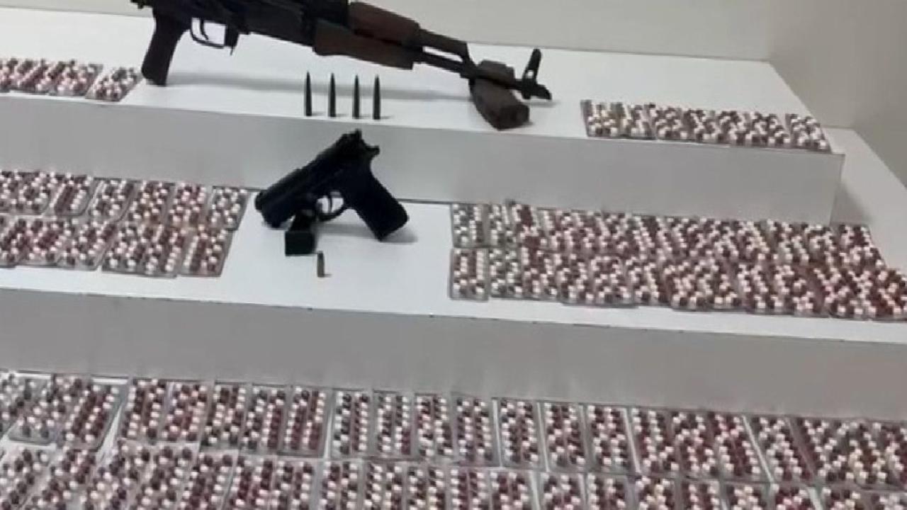Evde yapılan aramalarda 1 uzun namlulu tüfek, ruhsatsız tabanca, 2 şarjör, 5 fişek ve bin 820 adet uyuşturucu hap ele geçirildi.