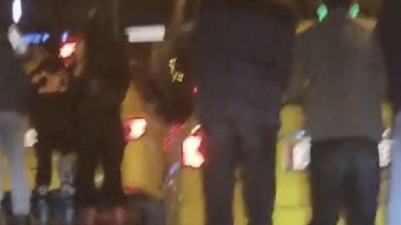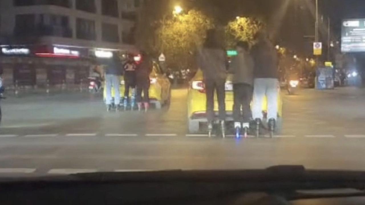 Patenli 6 kişi trafikte seyir halinde olan iki taksinin arkasına tutunarak ilerlemeye başladı.