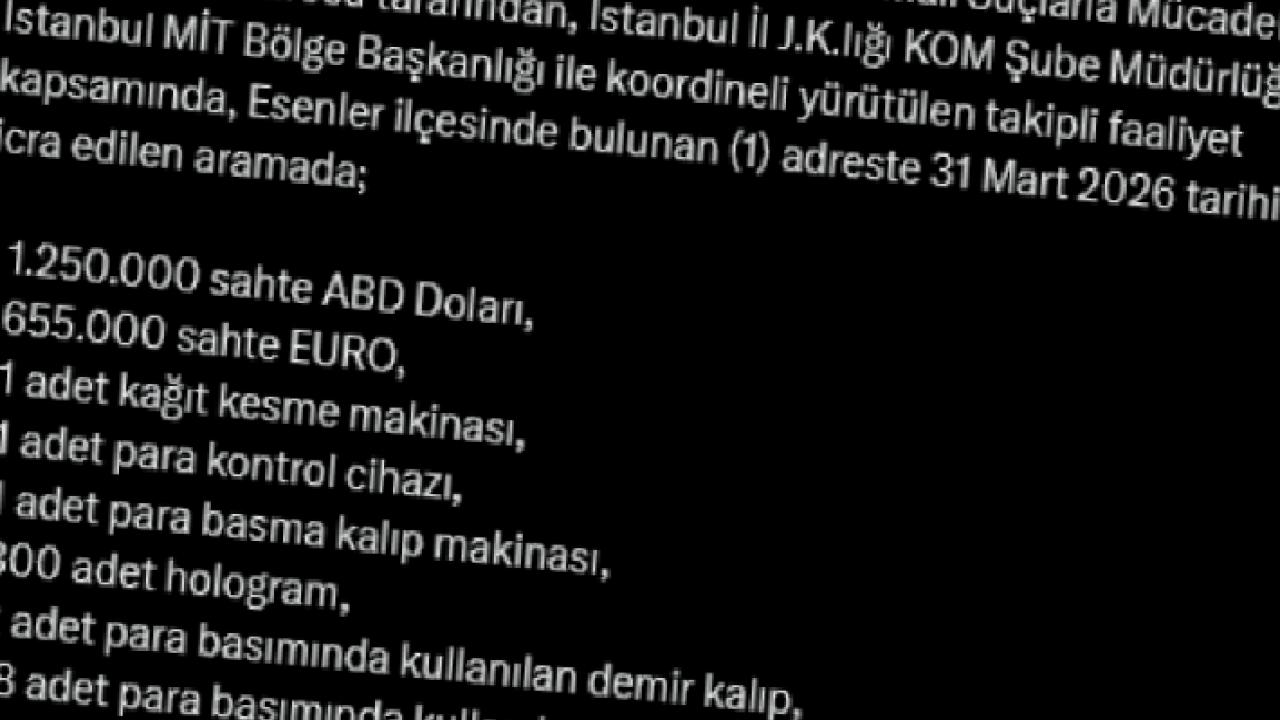 31 Mart 2026 tarihinde Esenler’de bulunan bir adreste yapılan arama sonucu, çok sayıda sahte döviz ve para basımında kullanılan ekipman ele geçirildi.