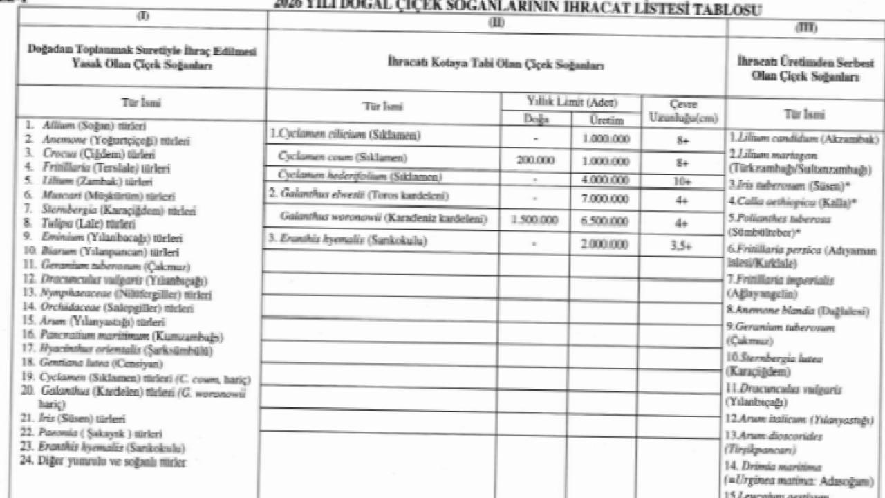 Tebliğin amacı; 2026 yılında doğadan toplanan ve üretilen çiçek soğanlarının ihracat miktarlarını, çevre ölçülerini, familya ve tür bazındaki sınırlamaları belirlemek olarak açıklandı. Tebliğ kapsamında soğan, yumru, rizom ve kormdan oluşan doğal çiçek soğanlarının ihracatının nasıl yapılacağı detaylandırıldı.