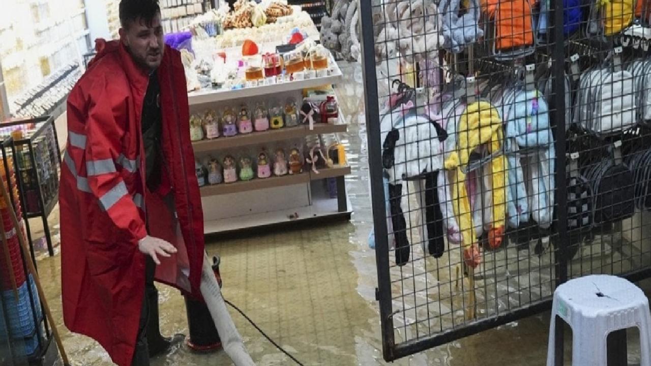 Esnaf, dükkanlarında biriken suyu fırça yardımıyla tahliye etmeye çalıştı.