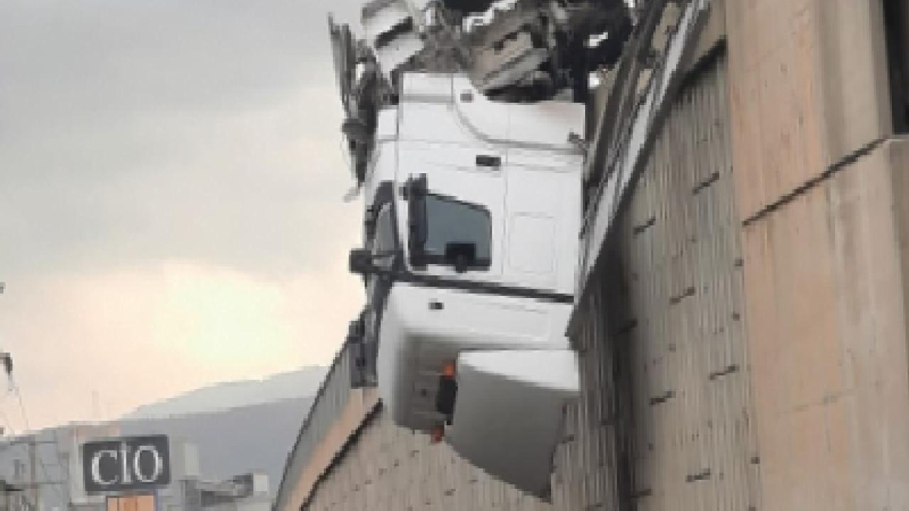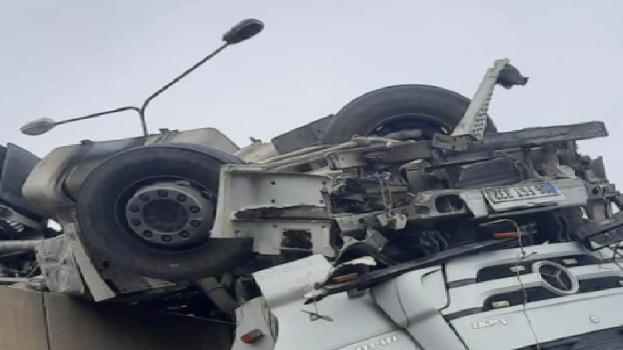 Ankara Caddesi 4. Sanayi Sitesi girişindeki yolda kontrolden çıkan tır, yaklaşık 12 metrelik viyadükte asılı kaldı.