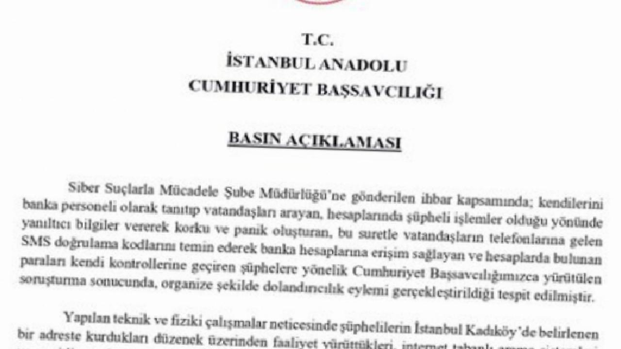 İSTANBUL () - İstanbul Anadolu Cumhuriyet Başsavcılığı, siber dolandırıcılık yöntemleriyle vatandaşları hedef alan bir şebekeye yönelik yürütülen soruşturmada önemli gelişmeler yaşandığını duyurdu.