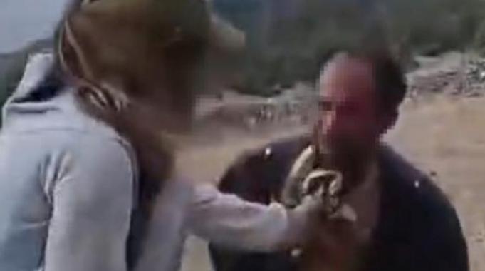 Görüntünün sonuna doğru ise elinde sopa ile halay çekmeye başlayan kız, çobanı yakasından tutup kendisi ile halay çekmeye zorlayarak sopayla dövdü.