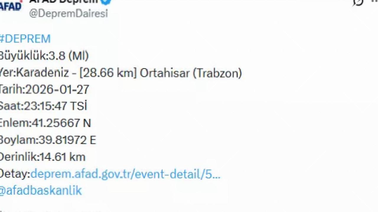 Afet ve Acil Durum Yönetimi Başkanlığı (AFAD) tarafından paylaşılan verilere göre, saat 23:15'te Trabzon'un Ortahisar ilçesinin yaklaşık 28 kilometre açıklarında deprem oldu.
