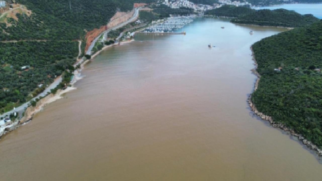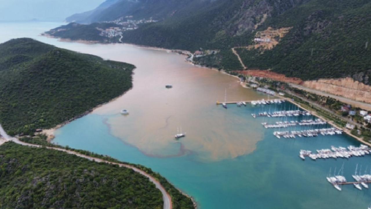 Yüksek kesimlerden gelen yağmur suları Marina, Kaş Limanı ve Küçük Çakıl Plajı çevresinde denizin rengini değiştirdi. Denizin bir tarafı maviliğini korurken diğer tarafı kahverengiye büründü.