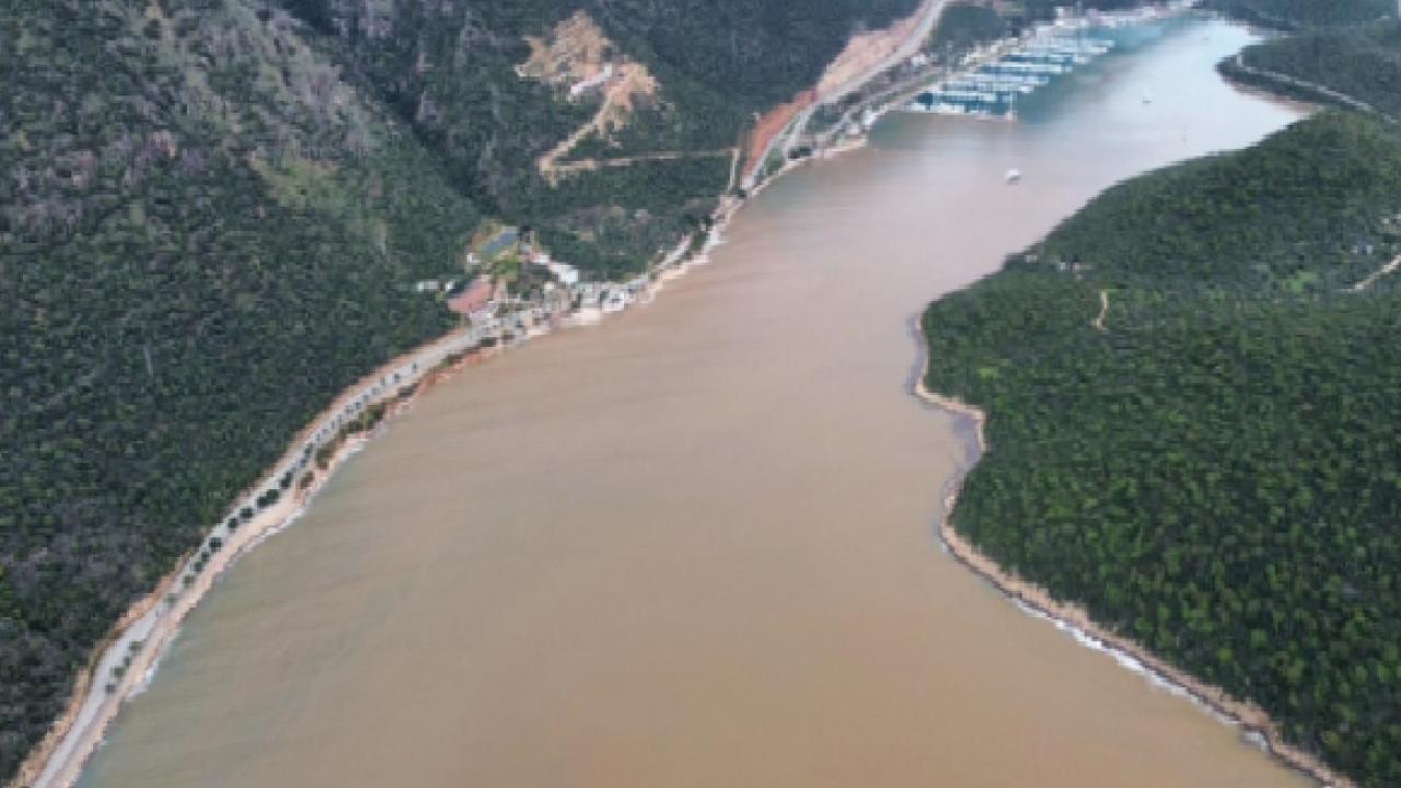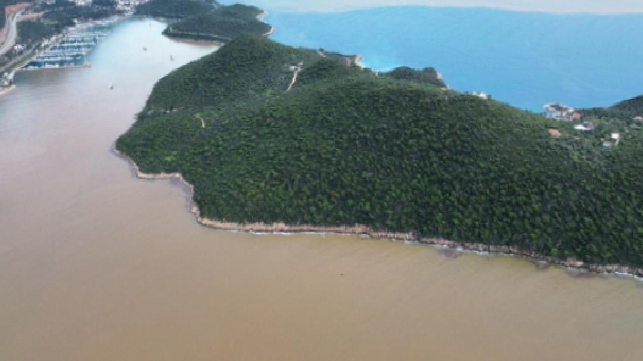 Antalya'nın Kaş ilçesinde sabah saatlerinde aniden bastıran kısa süreli sağanak sonrası denize ulaşan yağmur suları mavi ile kahverengi tonları birbirine karıştırdı.