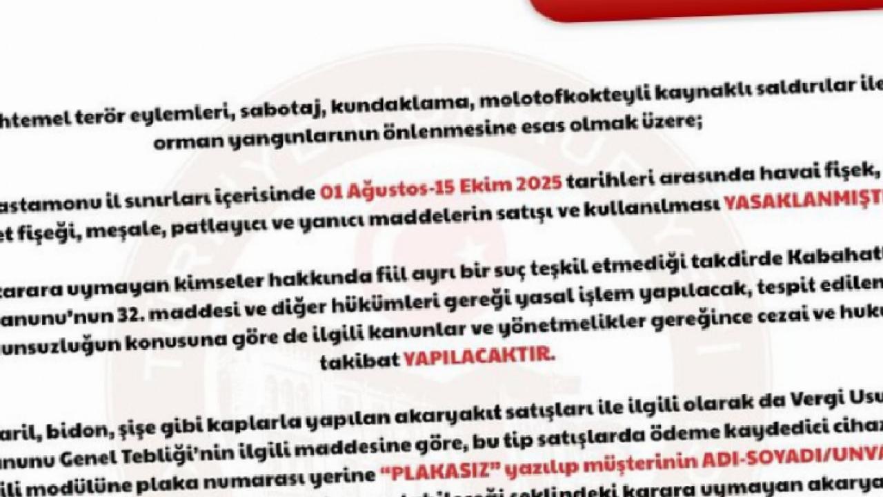 KASTAMONU () - Kastamonu Valiliği'nden yapılan yazılı açıklamada, kamu düzenini korumak ve orman yangınlarını önlemek amacıyla il genelinde yeni tedbirler alındığı duyuruldu.