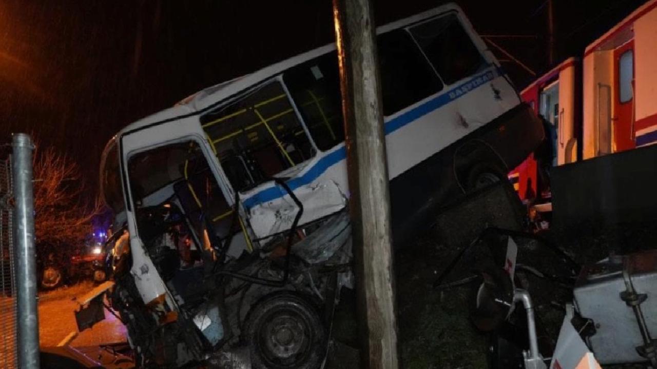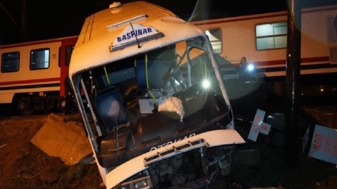 Hızla gelen yolcu treni rayda mahsur kalan dolmuşa çarptı.
