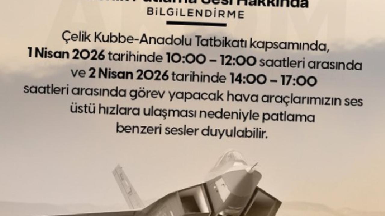 Yapılan açıklamaya göre, 1 Nisan 2026 tarihinde 10.00 – 12.00 saatleri arasında, 2 Nisan 2026 tarihinde ise 14.00 – 17.00 saatleri arasında görev yapacak hava araçlarının ses üstü hızlara ulaşması nedeniyle patlama benzeri sesler duyulabilecek.