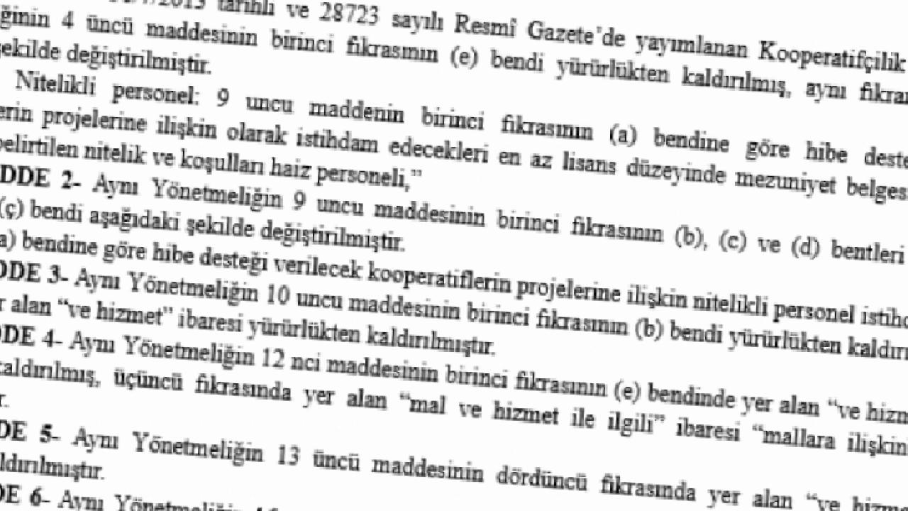 9. maddede ise bazı bentler yürürlükten kaldırılırken, hibe desteğinin nitelikli personel istihdamına yönelik kısmı yeniden şekillendirildi.Yönetmeliğin birçok maddesinde yer alan “ve hizmet” ibareleri metinden çıkarıldı. Böylece destek kapsamı mal alımlarıyla sınırlandırıldı. 25. maddede yapılan düzenlemeyle mal alımlarının, kooperatiflerin yüklenicilerle yapacağı sözleşmeler kapsamında gerçekleştirileceği hüküm altına alındı. Ayrıca 12. maddede “mal ve hizmet ile ilgili” ifadesi “mallara ilişkin” şeklinde değiştirildi.
