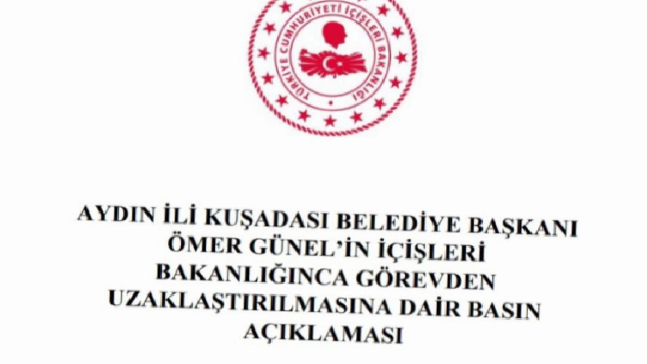 ANKARA () - İçişleri Bakanlığı, Aydın’ın Kuşadası ilçesi Belediye Başkanı Ömer Günel hakkında yürütülen soruşturma kapsamında görevden uzaklaştırma kararı aldı.