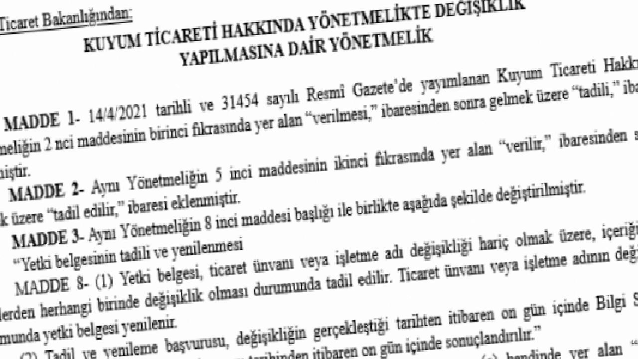 ANKARA () - Kuyum sektörünü ilgilendiren önemli bir düzenleme Ticaret Bakanlığı tarafından hayata geçirildi. Kuyum Ticareti Hakkında Yönetmelik’te yapılan değişiklikler, bugünkü Resmi Gazete’de yayımlanarak yürürlüğe girdi.