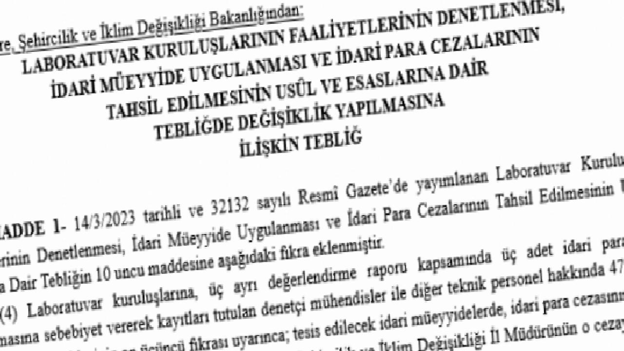ANKARA () - Çevre, Şehircilik ve İklim Değişikliği Bakanlığı, Laboratuvar Kuruluşlarının Faaliyetlerinin Denetlenmesi, İdari Müeyyide Uygulanması ve İdari Para Cezalarının Tahsil Edilmesinin Usûl ve Esaslarına Dair Tebliğ'de Değişiklik Yapılmasına İlişkin Tebliğ'i Resmi Gazete'nin bugünkü sayısında yayımlanarak yürürlüğe girdi.