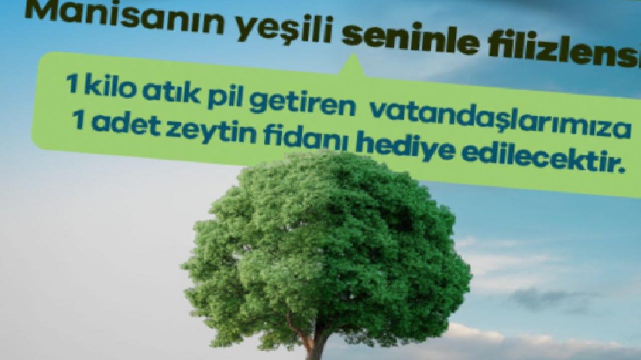 Manisa Büyükşehir Belediyesi, çevreye duyarlı vatandaşları kampanya noktalarına davet ederek, “Bir pil getir, bir fidan dik — doğa nefes alsın” mesajı verdi.