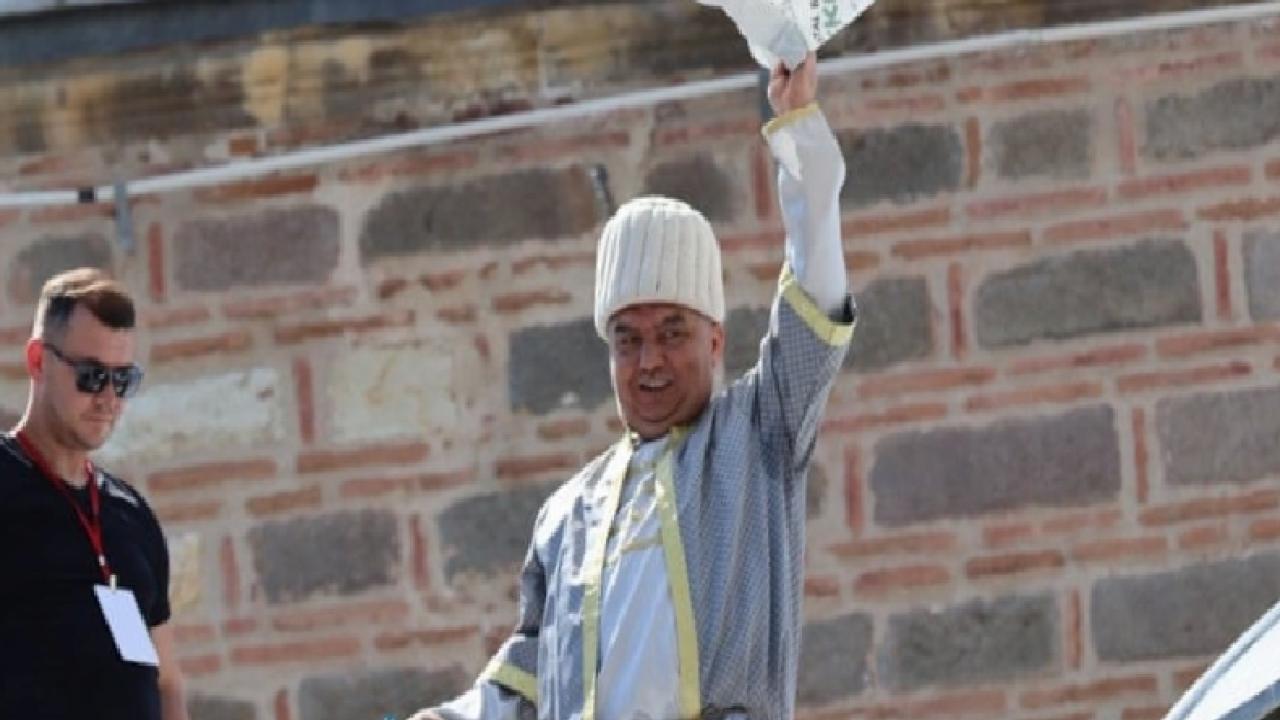 Kortejin Sultan Camisi’nde sona ermesinin ardından gözler geleneksel saçım törenine çevrildi. Öğle ezanı sonrasında temsili olarak Hafsa Sultan’ın, Merkez Efendi’ye mesirin halka dağıtılması için izin vermesi canlandırıldı.