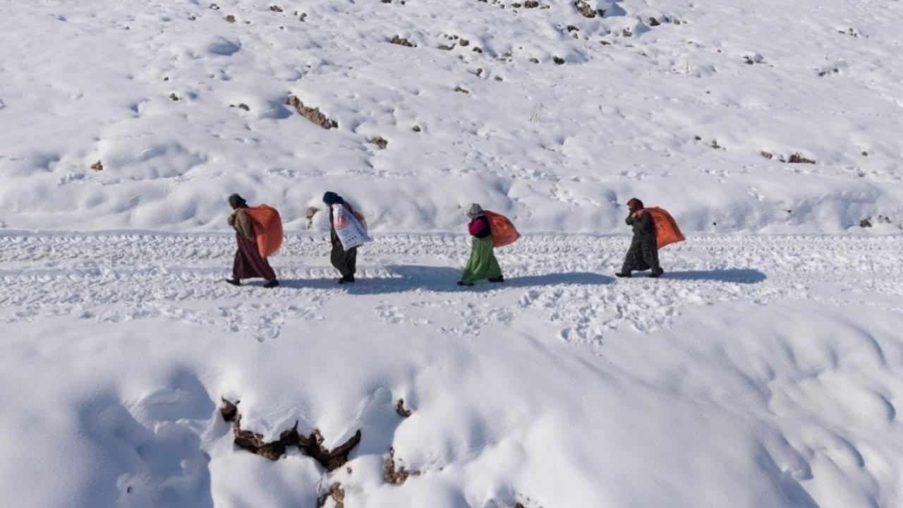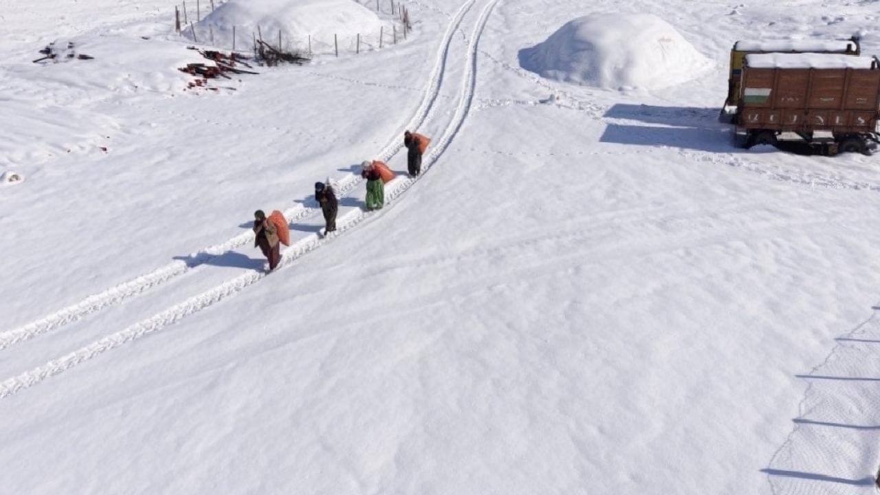 Sabahın ilk saatlerinden itibaren işe koyulan kadınlar, onlarca kiloluk saman çuvallarını omuzlayarak metrelerce yol kat ediyor. Kar kalınlığının yürümeyi güçleştirdiği arazide, dondurucu soğuğa rağmen hayvanlarına yem ulaştırmaya çalışan kadınların mücadelesi, bölgedeki yaşam koşullarının zorluğunu gözler önüne seriyor.