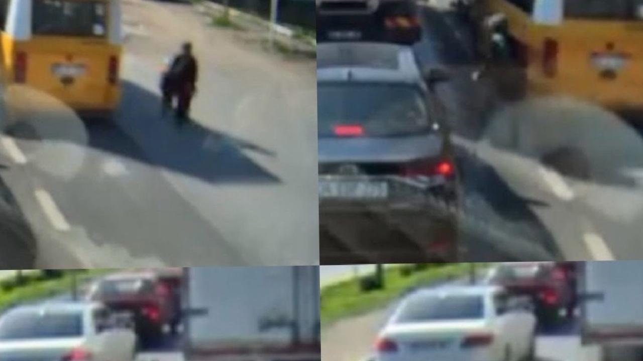 Korku dolu anlar ise bir aracın kamerasına saniye saniye yansıdı. Görüntülerde, trafiğin durduğu sırada çocuğuyla birlikte karşıya geçmeye çalışan kadına, araçların arasından gelen motosikletin çarptığı anlar yer aldı.