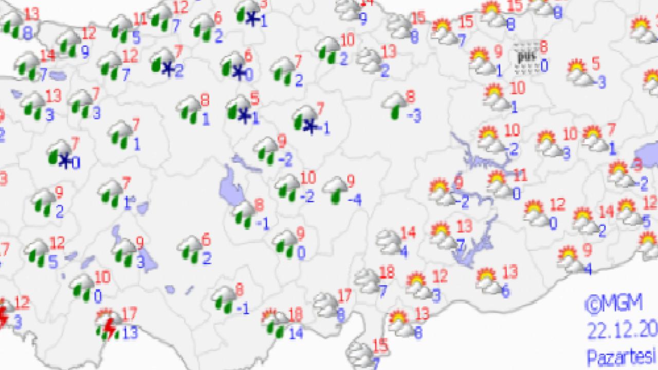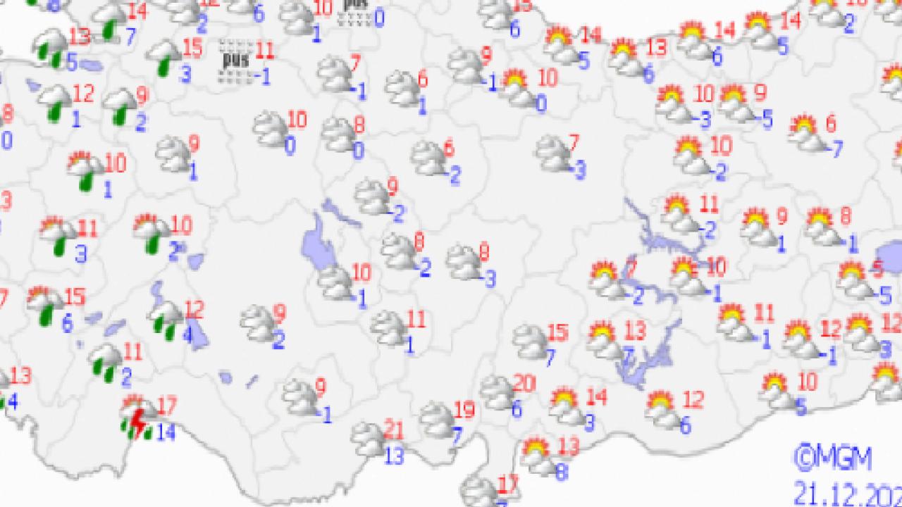 Meteoroloji Genel Müdürlüğü tarafından yapılan tahminlere göre; ülkemiz genelinin parçalı yer yer çok bulutlu, Marmara'nın doğusu, Batı Akdeniz, Tekirdağ, İzmir, Aydın, Muğla, Afyonkarahisar, Kütahya, Zonguldak, Bolu, Düzce, Erzincan, Tunceli çevreleri, Kırklareli'nin kıyı kesimleri, Ankara ve Eskişehir'in güneyi, Konya'nın kuzey ve batısı ile Erzurum'un batısının yağmur ve sağanak yağışlı, Güney Ege kıyıları ile Batı Akdeniz kıyılarının gök gürültülü sağanak yağışlı geçeceği tahmin ediliyor. Yağışların; Muğla ve Antalya çevrelerinde yerel kuvvetli olması bekleniyor. Sabah ve gece saatlerinde iç ve doğu bölgelerde pus ve yer yer sis bekleniyor.