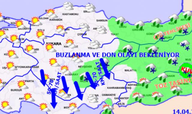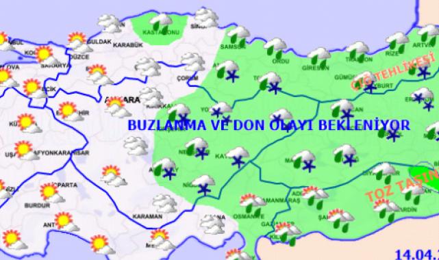 Bu sabah ve gece saatlerinde Marmara’nın güney ve doğusu, İç Anadolu, İç Ege, Göller Yöresi, Karadeniz’in iç kesimleri ile Doğu Anadolu’da zirai don hadisesi beklendiğinden tarımsal faaliyetlerle uğraşan vatandaşlarımızın, Meteoroloji Genel Müdürlüğü tarafından il ve ilçelere yönelik hazırlanan sıcaklık tahminlerini dikkatle takip etmeleri ve zirai don riskine karşı gerekli tedbirleri almaları önem arz etmektedir.
