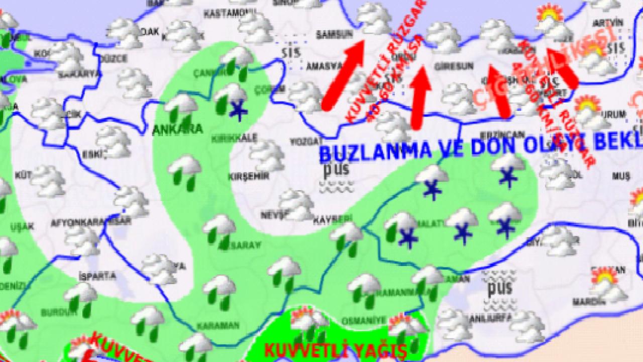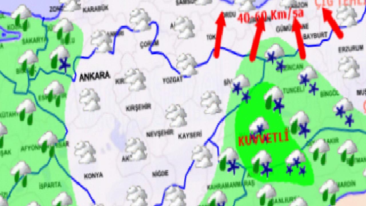 ANKARA () - Marmara, Ege, Akdeniz, İç Anadolu ve Güneydoğu Anadolu ile Batı Karadeniz'in batı, Doğu Anadolu'nun güney ve batı kesimlerinin yağışlı geçeceği, genellikle yağmur ve sağanak, yurdun doğu kesimlerinde karla karışık yağmur ve kar şeklinde görülecek yağışların, Ege ve Akdeniz kıyıları, Güneydoğu Anadolu ve Doğu Anadolu'nun güney ve batısında yer yer kuvvetli olacağı tahmin ediliyor. Doğu Karadeniz’in iç kesimlerinin yüksekleri ile Doğu Anadolu’nun doğusunun yüksek kar örtüsüne sahip eğimli kesimlerinde çığ tehlikesi bulunmaktadır.