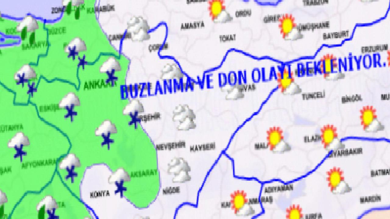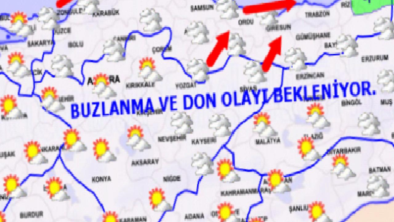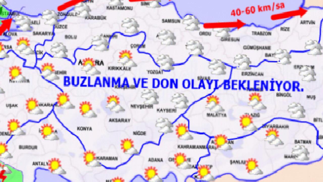 Kuzey, iç ve doğu kesimlerde buzlanma ve don olayı beklendiğinden yaşanabilecek olumsuzluklara karşı dikkatli ve tedbirli olunması gerekmektedir.