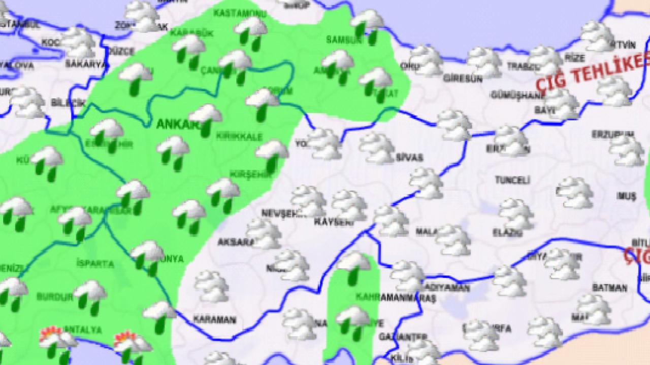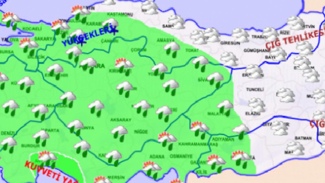Marmara, Ege, Akdeniz, İç Anadolu, Batı ve Orta Karadeniz'in iç kesimleri, Güneydoğu Anadolu'nun batısı ile Samsun, Şırnak, Hakkari, Ağrı, Kars, ve Ardahan çevreleri ile Erzurum, Bitlis ve Siirt'in doğusunun yağışlı geçeceği tahmin ediliyor.