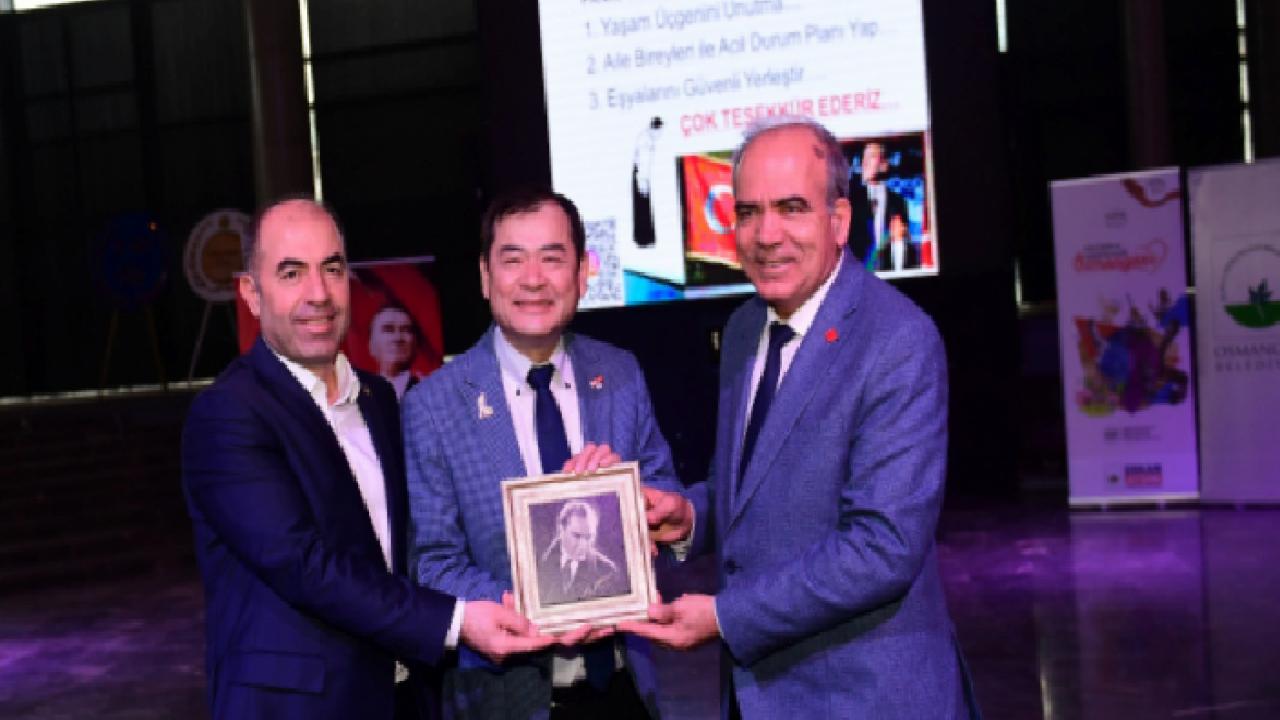 Söyleşinin ardından CHP Osmangazi İlçe Başkanı Raşit Gürbüz ve Osmangazi Belediyesi Meclis Üyesi Bakır Taşer, Yoshinori Moriwaki’ye teşekkür plaketi takdim etti.