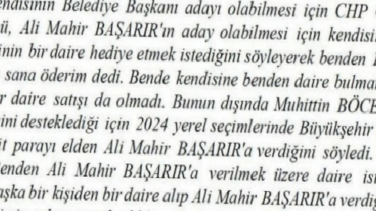 Muhittin Böcek Antalya Büyükşehir Belediye başkanı adayı olmadan önce kendisi ile yapmış olduğumuz görüşmede kendisinin Belediye Başkanı adayı olabilmesi için CHP Grup Başkan Vekili Ali Mahir Başarır ile görüştüğünü, Ali Mahir Başarır'ın aday olabilmesi için kendisini desteklediğini belirterek, Ali Mahir Başarır'a kendisinin bir daire hediye etmek istediğini söyleyerek benden 1 adet daire talebinde bulundu.