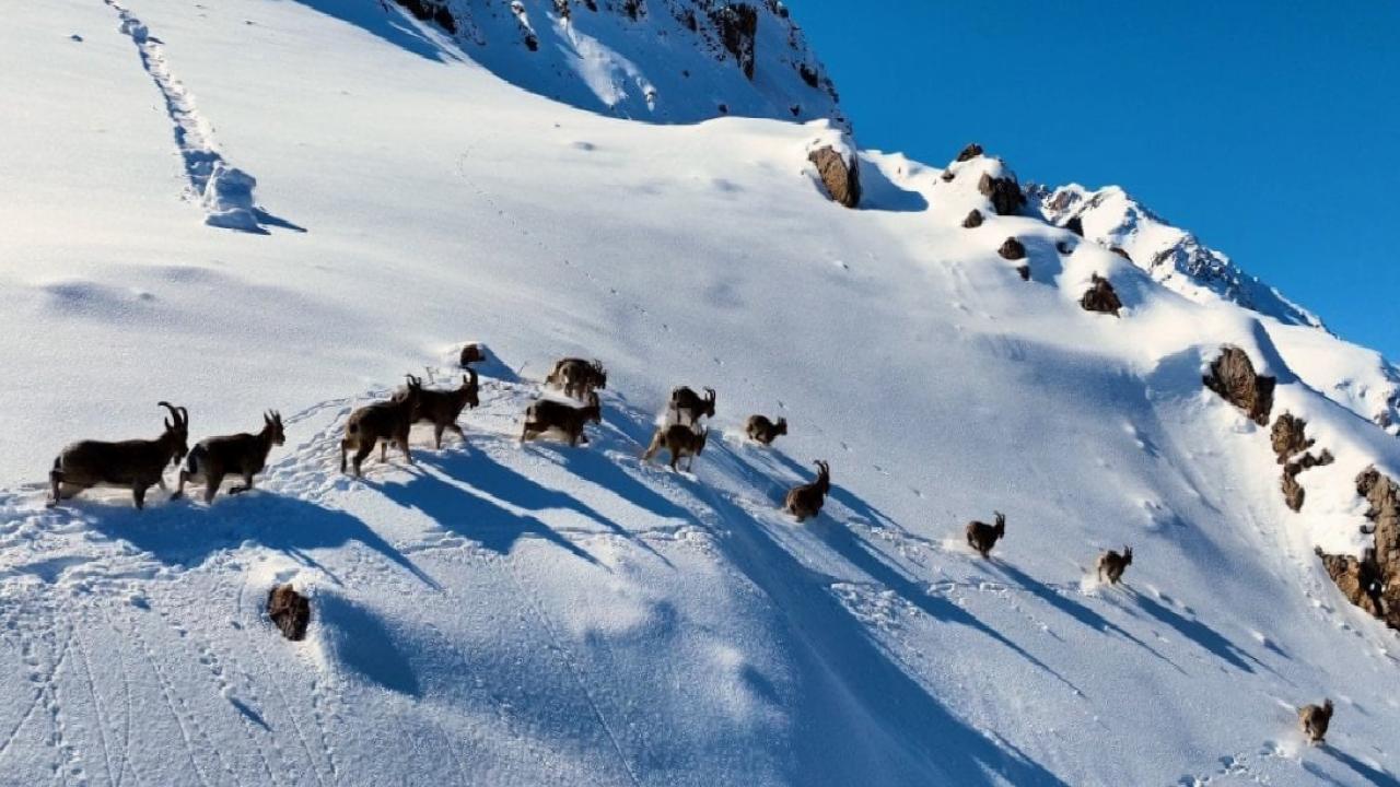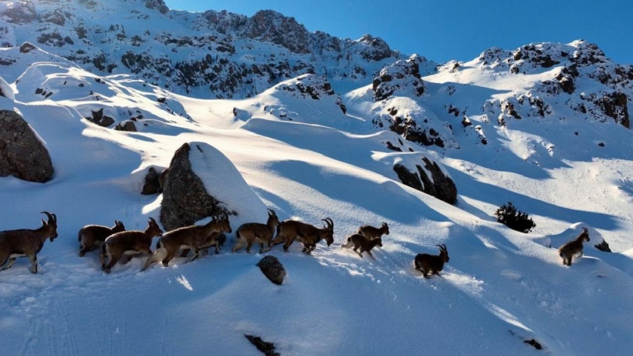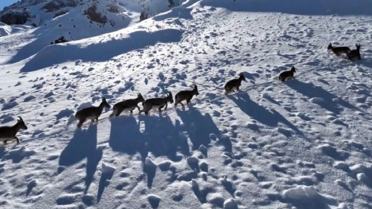 Doğa Koruma Birliğinin (IUCN) yayımladığı Nesli Tükenme Tehlikesi Altında Olan Türlerin Kırmızı Listesi’nde yer alan yaban keçileri, karlı dağları aşarken belgesel tadında görüntüler oluşturdu.
