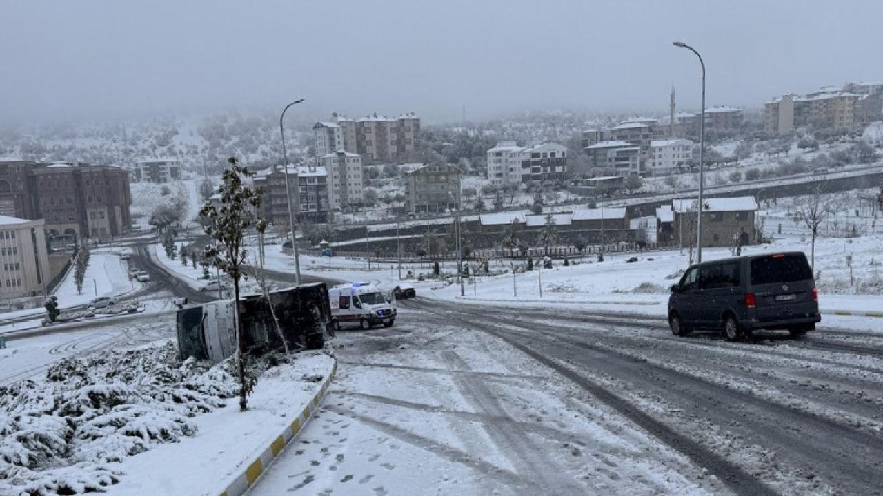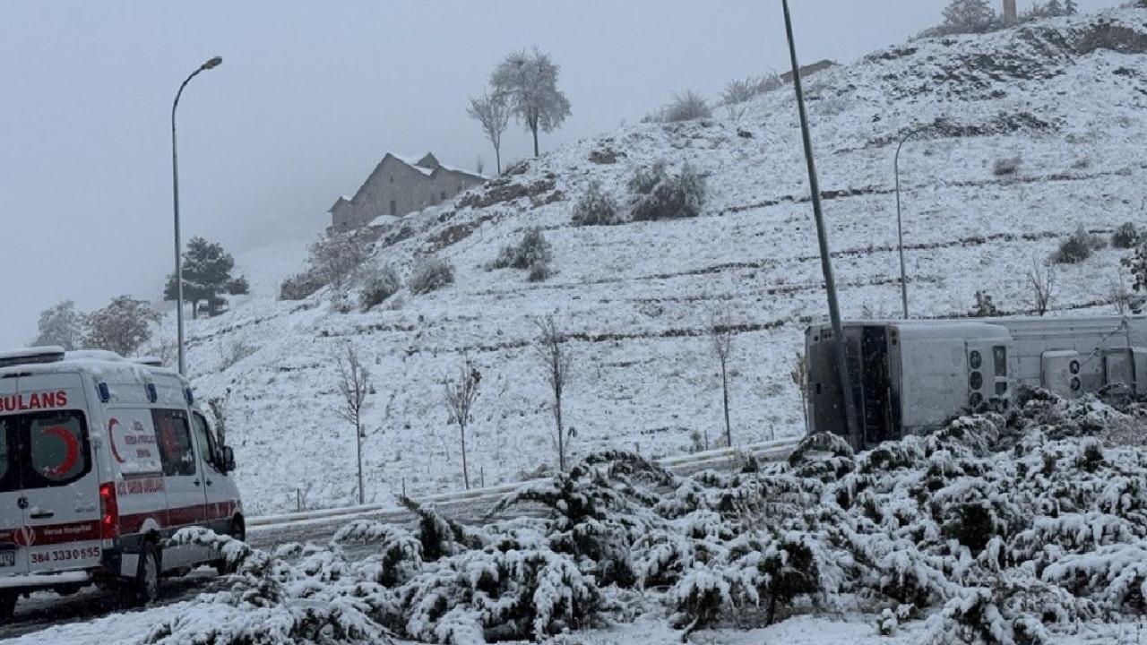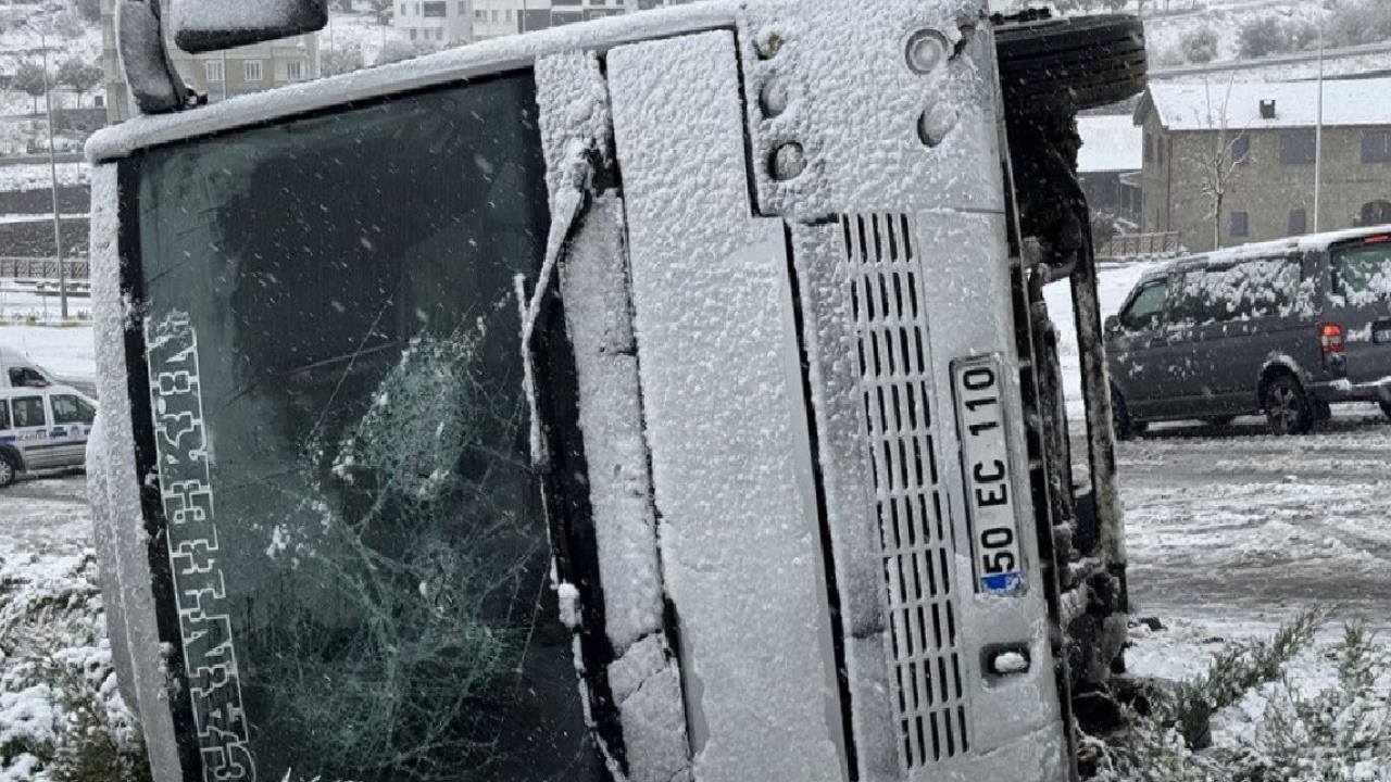 Nevşehir'de Abdullah Ağmanalmaz idaresindeki 50 EC 110 plakalı minibüs, Yavuz Sultan Selim Mahallesi Kayaşehir yolunda, kar yağışının ardından kayganlaşan yolda refüje çarparak devrildi.
