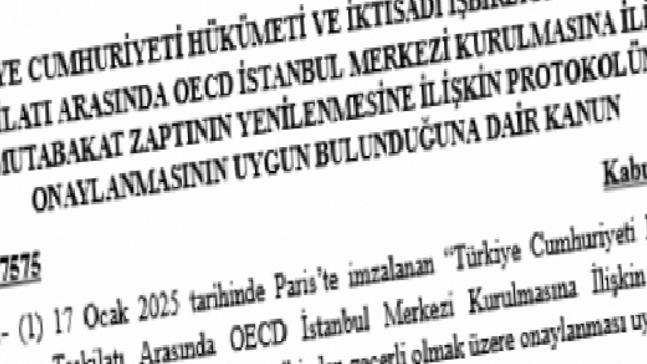 ANKARA () - Türkiye ile Ekonomik İşbirliği ve Kalkınma Teşkilatı (OECD) arasında İstanbul’da kurulacak merkeze ilişkin mutabakat zaptının yenilenmesine dair protokolün onaylanması uygun bulundu. 7575 sayılı kanun, Resmi Gazete’de yayımlanarak yürürlüğe girdi.