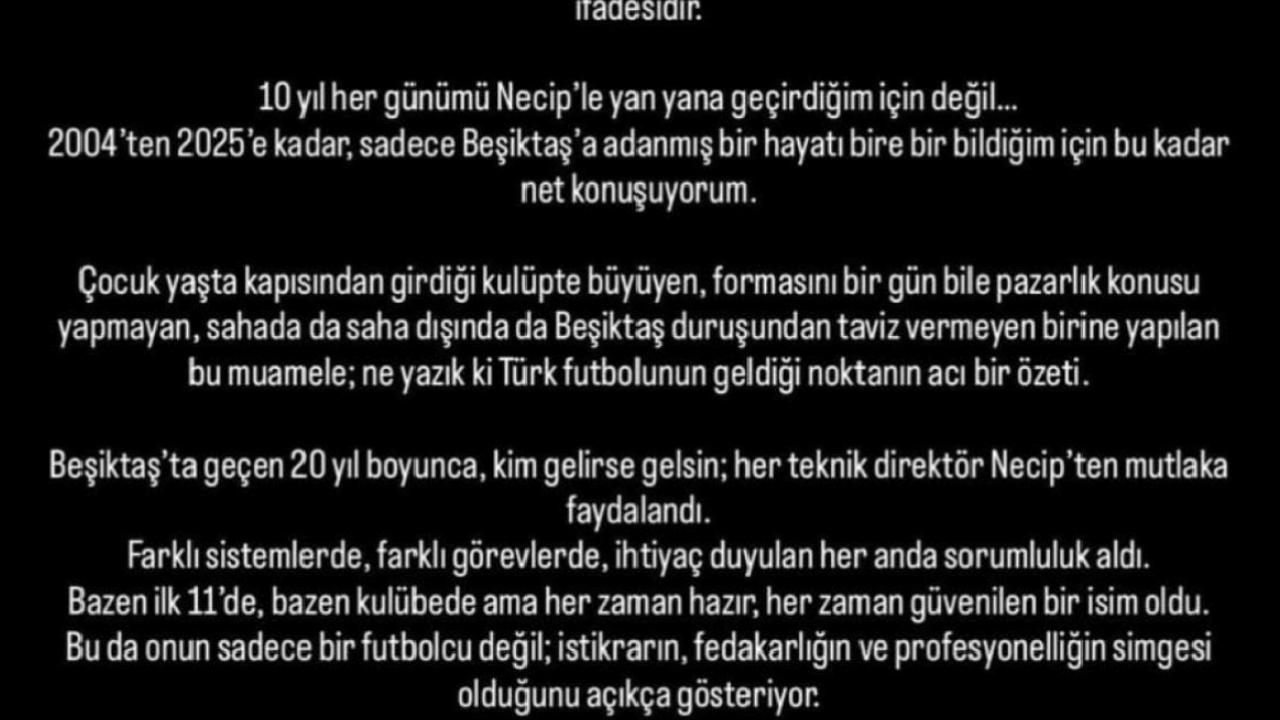 Çocuk yaşta kapısından girdiği kulüpte büyüyen, formasını bir gün bile pazarlık konusu yapmayan, sahada da saha dışında da Beşiktaş duruşundan taviz vermeyen birine yapılan bu muamele; ne yazık ki Türk futbolunun geldiği noktanın acı bir özeti.