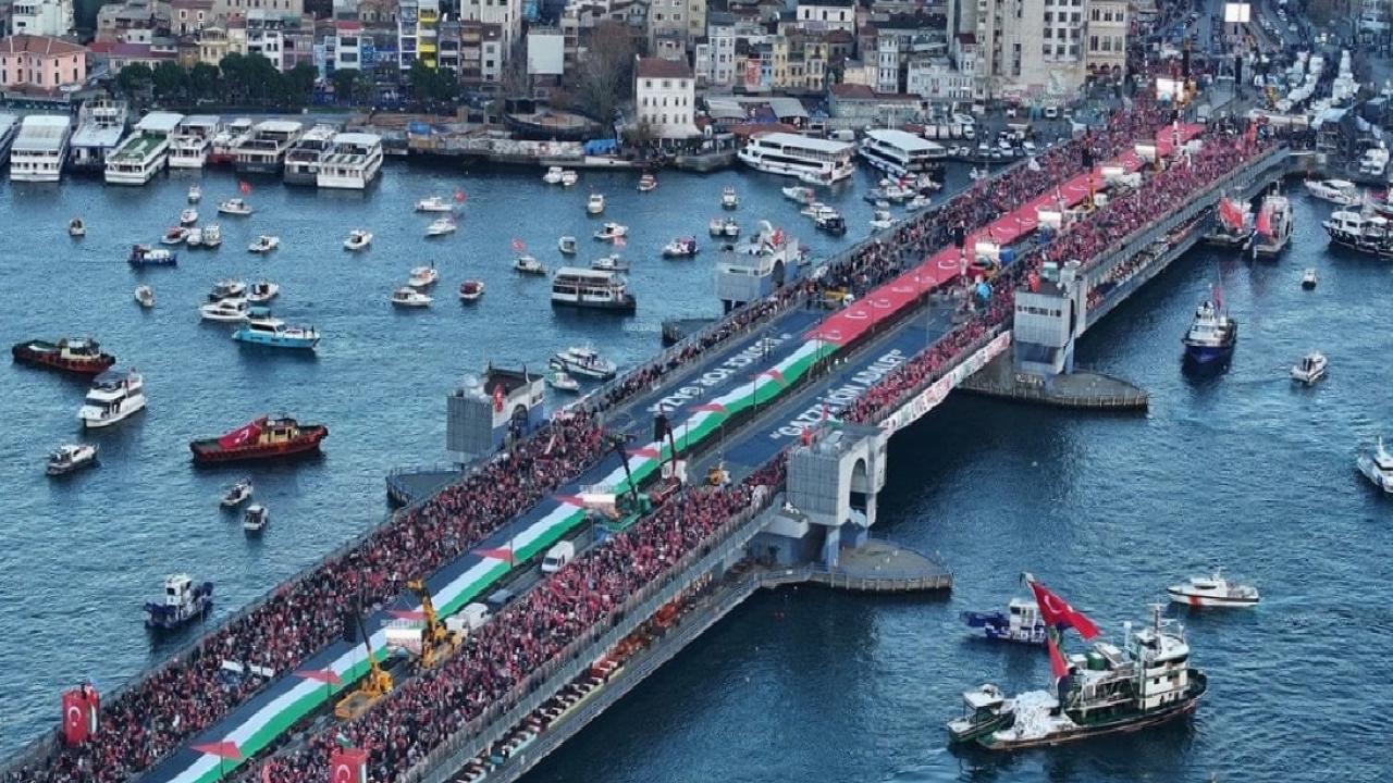 Filistin'e destek için camilerin önündeki alanda toplanan vatandaşların ellerinde Türk ve Filistin bayrakları ile Galata Köprüsü'ne yürümeye başladı.