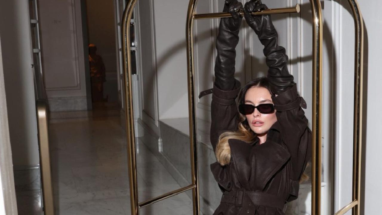 Sezen'in trençkot kombini ve derin bacak dekoltesi dikkat çekerken yürüyüşü de sosyal medyada konuşuldu.
