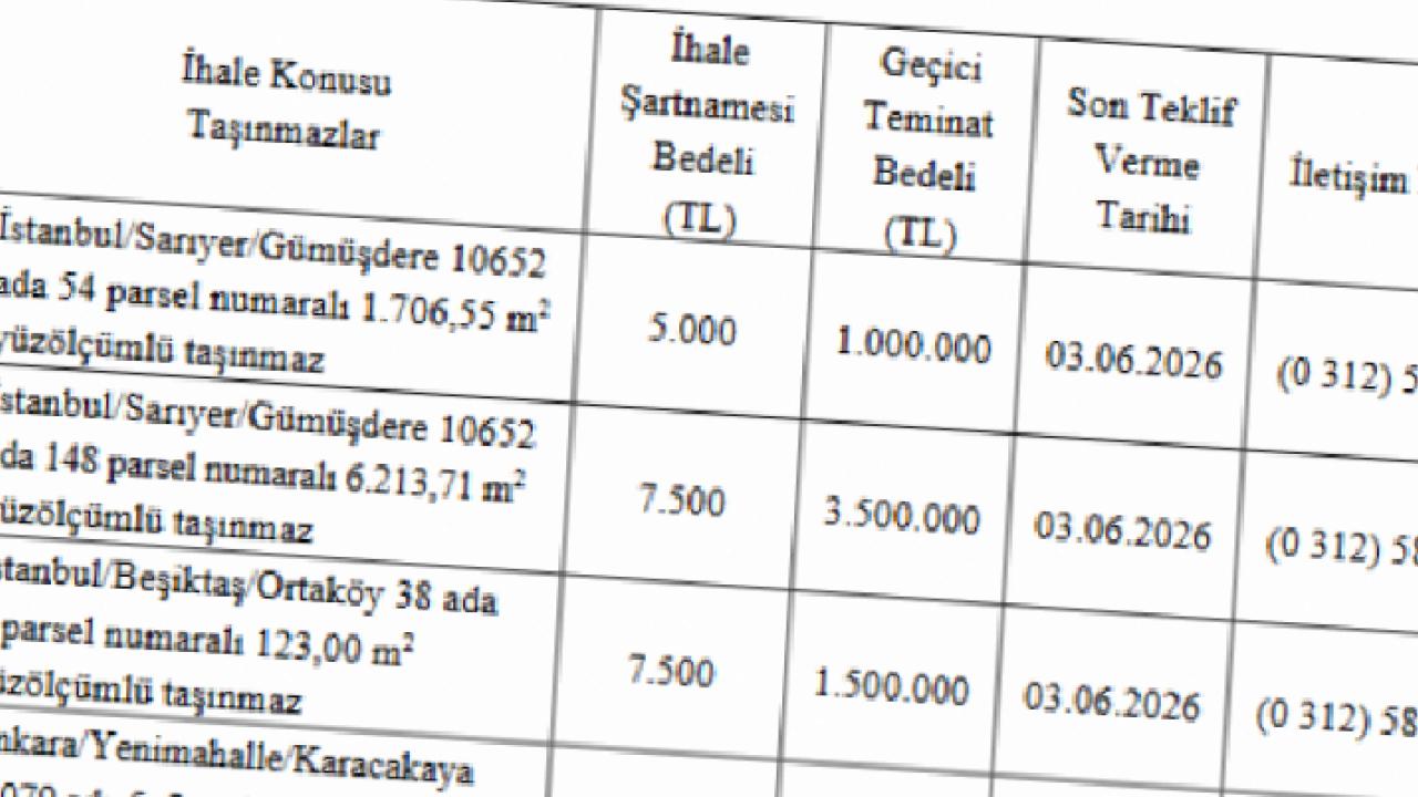 İstanbul ve Ankara illerinde yer alan toplam 6 taşınmaz, 4046 sayılı Özelleştirme Kanunu çerçevesinde “satış” yöntemiyle ihale edilecek. Taşınmazlar arasında Sarıyer (İstanbul), Beşiktaş (İstanbul), Yenimahalle (Ankara) ve Gölbaşı (Ankara) gibi bölgelerde yer alan arsalar bulunuyor.