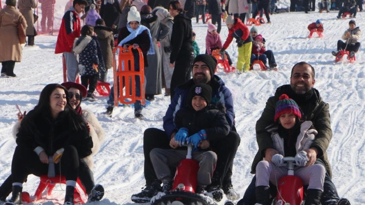Karnelerini aldıktan sonra aileleriyle birlikte tatil için denizden 3 bin 176 metre yükseklikteki Palandöken Kayak Merkezi'ne gelen çocukların bazıları kayak öğrenirken, bazıları da kızaklarla pistte kaymanın keyfini yaşıyor.