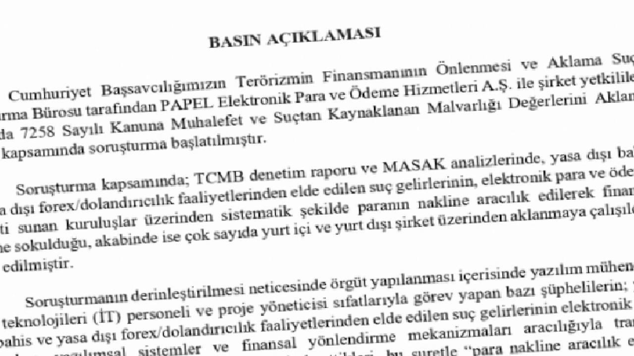 İSTANBUL () - İstanbul Cumhuriyet Başsavcılığı Terörün Finansmanının Önlenmesi ve Suçtan Kaynaklanan Malvarlığı Değerlerini Aklama Suçları Soruşturma Bürosu tarafından yürütülen soruşturma kapsamında, PAPEL Elektronik Para ve Ödeme Hizmetleri A.Ş. ve şirket yetkilileri hakkında 7258 sayılı Kanun’a muhalefet ile kara para aklama suçlarından soruşturma başlatıldı.