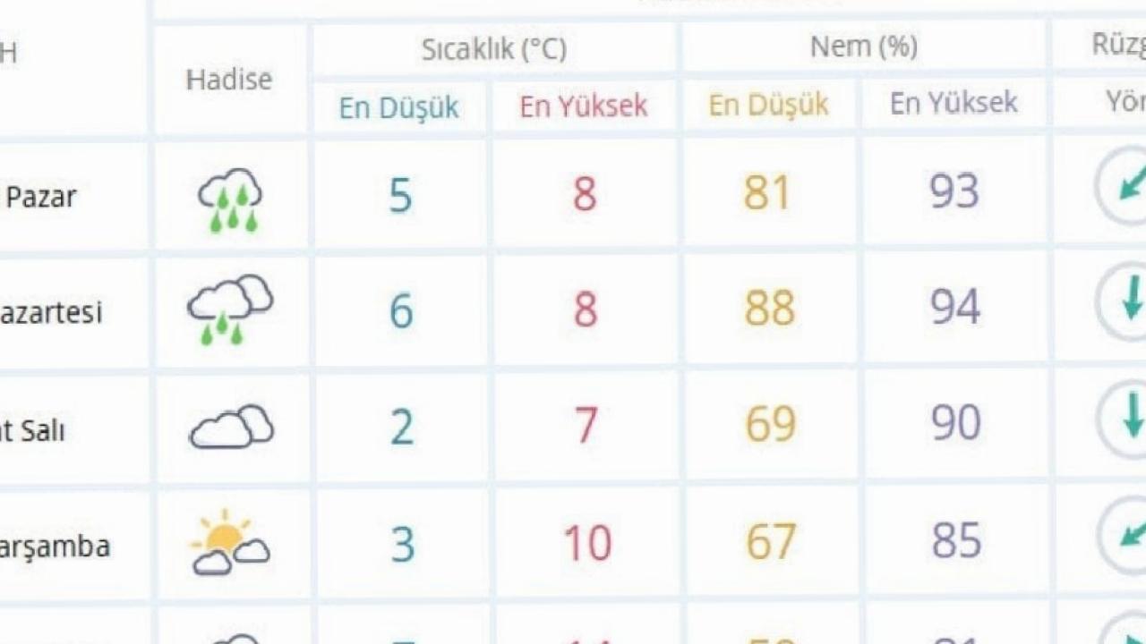 Havanın pazartesi günü çok bulutlu, aralıklarla yağmur ve sağanak yağışlı olacağı, yağışların yerel olarak kuvvetli, en düşük sıcaklığın 6, en yüksek sıcaklığın 8 derece olmasının beklendiği aktarılan açıklamada salı günü parçalı ve çok bulutlu, en düşük sıcaklığın 2, en yüksek sıcaklığın ise 7 derece olabileceği belirtildi.