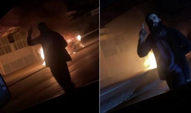 O esnada taksitle aldığı otomobilini, İsrail'e tepki için yaktığını iddia eden ve ismi öğrenilemeyen araç sahibi "Kahrolsun İsrail" sloganı attı.