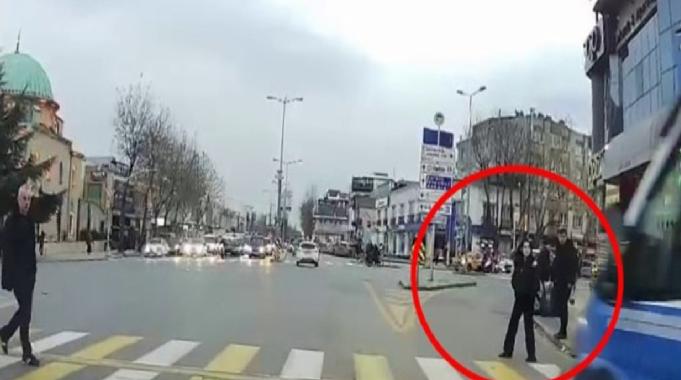 Minibüsün kırmızı ışıkta yaya geçidinden geçerek trafik güvenliğini tehlikeye attığı ve yaya geçidinden geçmek üzere olan bir yayaya çarpmaktan kıl payı kurtulduğu anlar ise farklı bir araç kamerası tarafından saniye saniye kaydedildi.