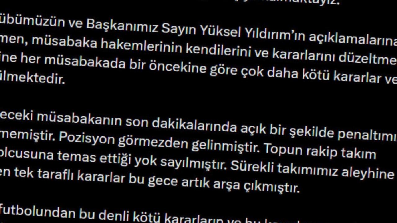 Kulübümüzün ve Başkanımız Sayın Yüksel Yıldırım'ın açıklamalarına rağmen, müsabaka hakemlerinin kendilerini ve kararlarını düzeltmediği; aksine her müsabakada bir öncekine göre çok daha kötü kararlar verdiği görülmektedir.