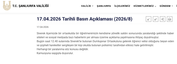 ŞANLIURFA () - Şanlıurfa’nın Siverek ilçesinde bir ortaokulda öğretmenin saldırıya uğradığı yönündeki iddialar üzerine resmi açıklama yapıldı.