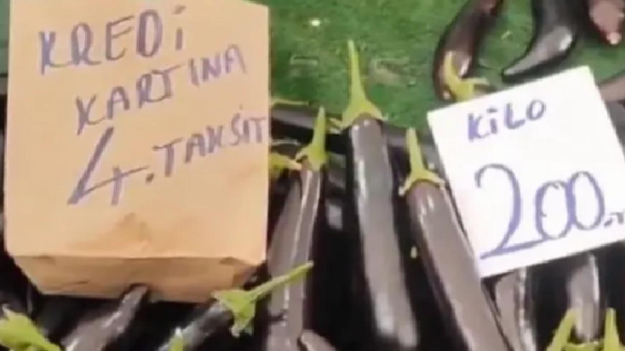 Artan fiyatlar karşısında müşterilerin alım gücünün düştüğünü söyleyen pazarcı, kilosu 200 liraya ulaşan patlıcanı kredi kartına 4 taksit imkanıyla satmaya başladı. Tezgaha asılan "4 taksit patlıcan" yazısı kısa sürede hem pazarda hem de sosyal medyada gündem oldu.
