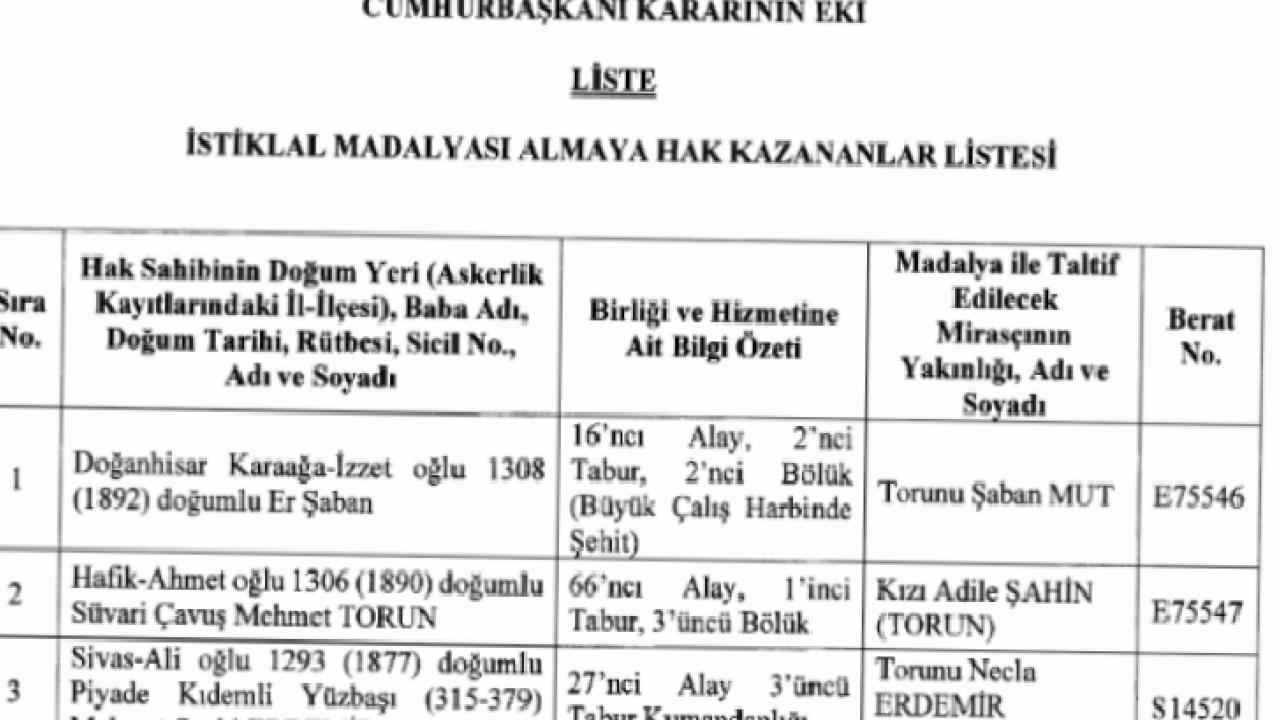 ANKARA ()- Cumhurbaşkanı kararı ile Kurtuluş Savaşı’nda hizmetleri resmi kayıtlarla tespit edilen bazı kahramanlardan üç mirasçıya daha “İstiklal Madalyası” verilecek.
