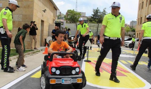 Şırnak'ta Trafik Haftası kutlamaları çerçevesinde, Şırnak İl Emniyet Müdürlüğü bahçesine kurulan trafik pistinde, öğrenciler uygulamalı olarak trafik kurallarını öğrendi.